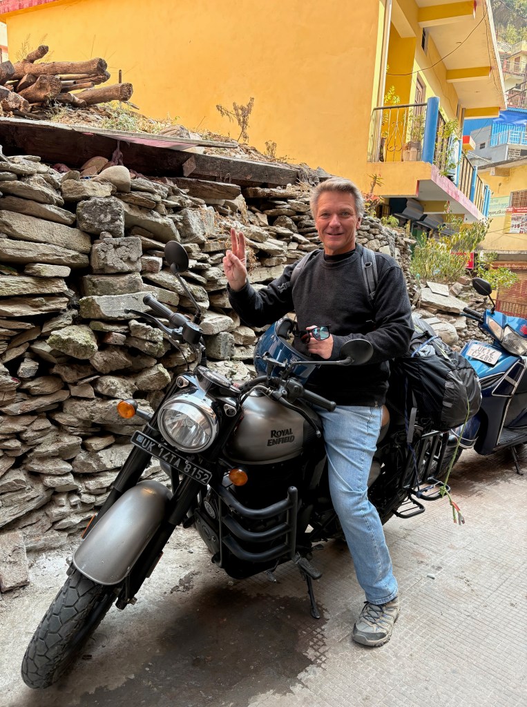 I rented a Royal Enfield 350 for a two-week period from a cool guy who knows Ravi from our Wheels of Awakening pilgrimage. What a wonderful omen! It took me two hours of riding winding roads with mountains rising up on either side and the Ganges flowing below, sometimes thousand foot cliffs right off to my side. Scattered houses and temples dotted the hills. When I got to Devprayag, I had to stop the bike to admire the wonder of this sacred town built into the mountains where the Alaknanda and Bhagirathi Rivers meet to form the beginning of the sacred Ganges River.