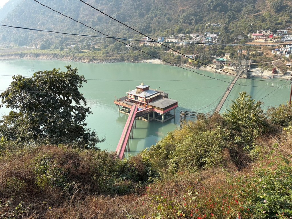 The Goddess Dhari is regarded as an avatar of Goddess Kali and is worshipped in her wrathful form. She is believed to protect the Char Dham — Kedarnath, Badrinath, Gangotri, and Yamunotri — and the devotees who undertake these sacred pilgrimages. Joyous worshipers streamed across the walkway to the temple or enjoyed the views from the nearby suspension bridge. A friendly couple chatted with me and welcomed me to India. What positive energy here!