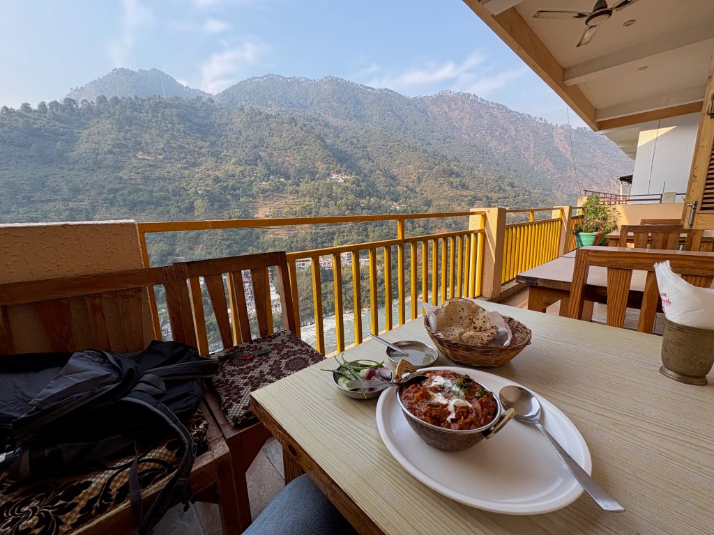 I stopped in Karnaprayag for the night, crossing over a bridge, winding through a jam-packed street full of chaotic movement, and up a steep, winding hill to my hotel, where a man came out as I approached and waved for me to park my bike. Nobody seemed in a rush to give me my room, so I went outside to enjoy the incredible view from the balcony and enjoyed a late lunch of Kadai Paneer and chapati.