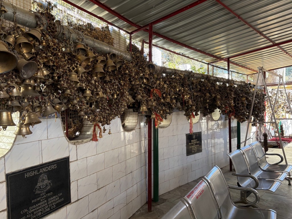 The route to Jhula Devi took me along the tops of mountains on winding roads and dead-ended at a military checkpoint. After parking my bike and chatting with the soldiers on guard, I went into the temple and was greeted by an elderly monastic who spoke excellent English. The holy shrine is dedicated to Goddess Durga, he told me, who fulfills the wishes of her devotees when they pray to her to remove obstacles from their path. When the wishes are fulfilled, the devotees return with bells to give to Goddess Durga. Thousands of them hang at the shrine. The monastic blessed me with a prayer of his own before I left.