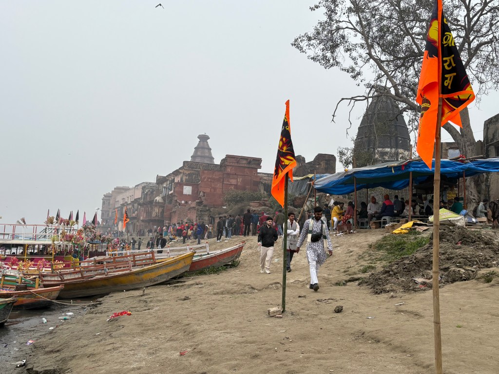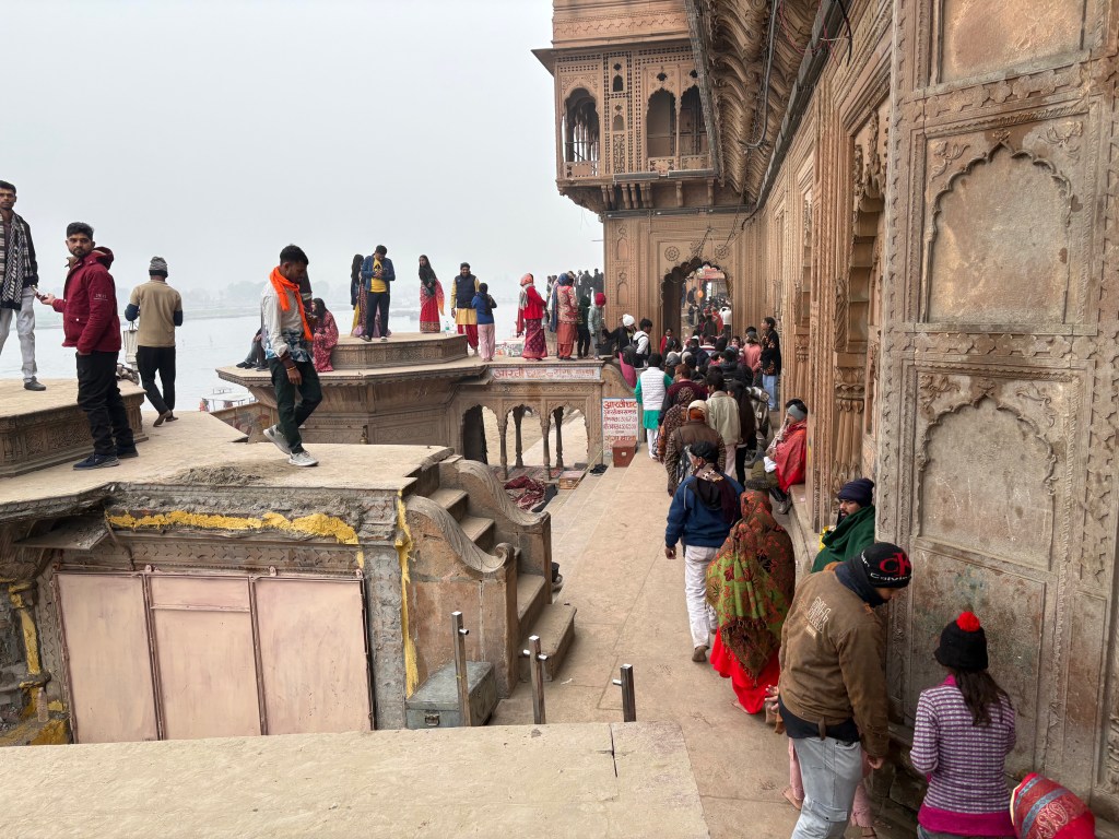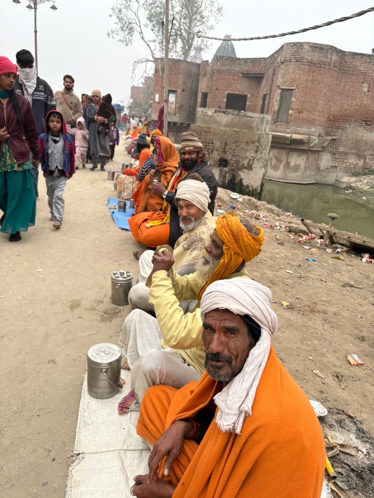 We tried to enter a few of the temples but found out they were closed until 5:00 pm, so we worked our way toward the riverbank and followed along its shores, making many new friends. The faces around us glowed with a spiritual energy I had never before seen. Imagine: it was a cold, damp day, and some of these people walked barefoot through the dirty streets, were shabbily clothed, begged for money or limped along with physical ailments. Elderly men and women hobbled along on crutches. No matter. They had transcended this bodily realm and sought divine blessings on this sacred day of renewal. Eyes shone with pure joy and smiles flashed with such purity and goodwill that our hearts sang the glory of existence. How incredible to witness such divine longing and devotion amid the ruins and poverty all around us. Everyone cried, “Radhe! Radhe!” expressing their love and devotion for the Goddess Radha, as well as wishing spiritual blessings upon us.