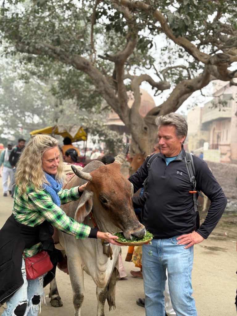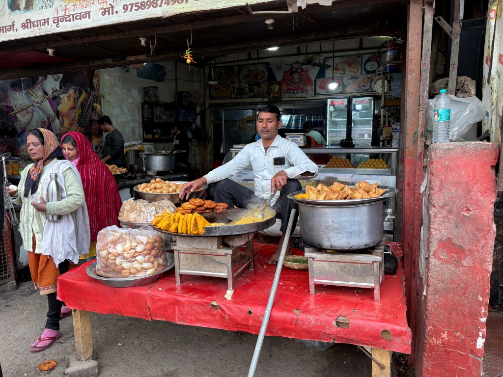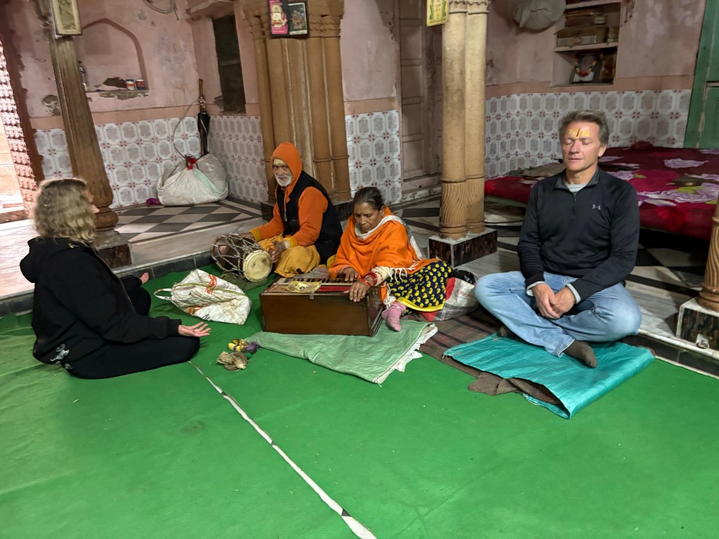 We came upon a small temple that had very few people about, so we quickly ducked inside. What a treat. An elderly man and woman chanted “Krishna Krishna, Radhe Radhe, Krishna Radhe, Radhe Krishna” while playing instruments. We sat with them and meditated in the lovely peace radiating within this ancient holy site. After an hour we left and encountered a group of articulate teenagers who wanted to know all about us, then went in search of food and eventually ate fruit on a stoop in a decrepit courtyard.