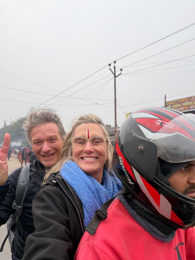 Fortunately, a young man named Ravi offered us a ride on his motorcycle for a nominal fee, so on we got, laughing that we were finally riding Indian style with three adults on the bike. Ravi maneuvered that bike like a master through the thronging crowd that just seemed to thicken down each bumpy road bordered by dilapidated shacks and temples on one side and food stands on the other. Cows wandered about oblivious to the commotion all about them. We jumped on and off the bike at some border points and got close enough to where we wanted to go that we decided to just walk. We got Ravi’s contact information — our God-sent savior for the next two days — and plunged into the jubilant masses, drawing an incredible amount of attention with just our presence.