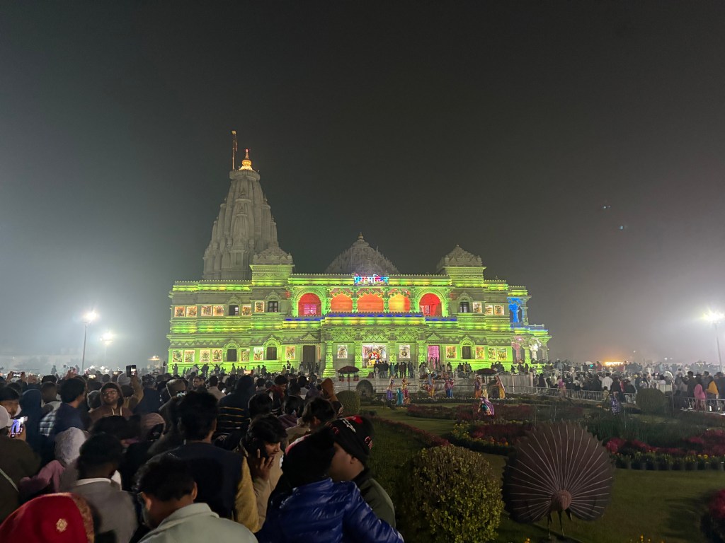 That evening I walked the short distance from the hotel to Prem Mandir, which promised some type of light show at the temple. Thousands streamed in the same direction but in a very orderly manner. Many appeared well dressed for the occasion. I thought it would be a nightmare getting inside, but everything went smoothly, probably because once inside, we could move through the expansive 55 acres that comprised the complex. Immediately I saw the glorious temple before me, changing colors every ten seconds. It was such an awe-inspiring sight that photos cannot do it justice.