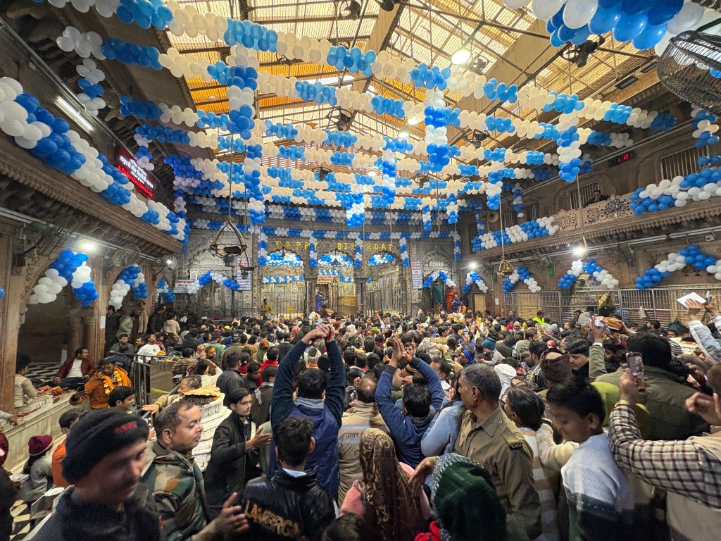 Then the real fun began. As people funneled inside the surge carried us upon a wave of bodies pushing forward toward the gated shrine. Once through the archways the temple opened as a giant square space with surrounding balconies and alcoves. At this point there was no control over our movements; we just flowed forward with the surge of devotees hollering their prayers and chants. Everyone wanted to get to the front to leave their offering or toss it as close as possible at the shrine.