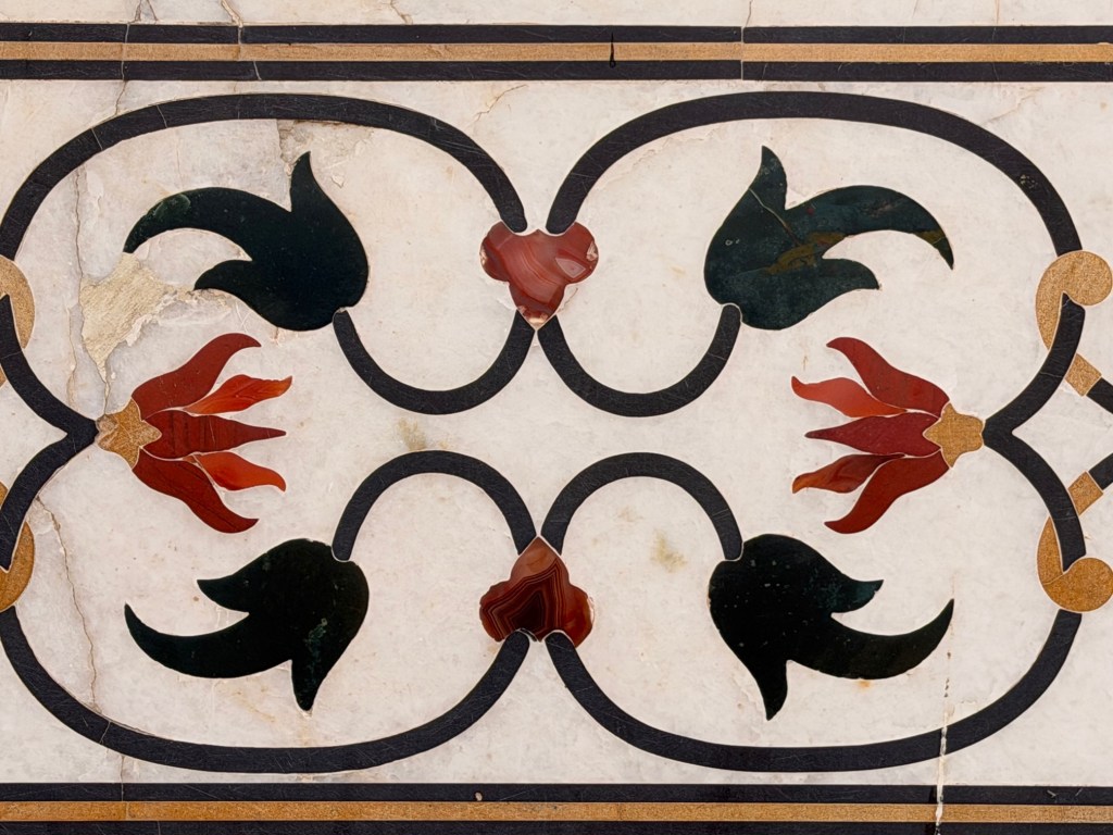 Twenty-eight varieties of precious and semi-precious stones from across Asia were used to inlay the intricate designs found all about the mausoleum. Eight intricate, pierced marble panels form an octagonal screen surrounding the tombs of the Emperor and his beloved wife. Each panel took five months to complete.