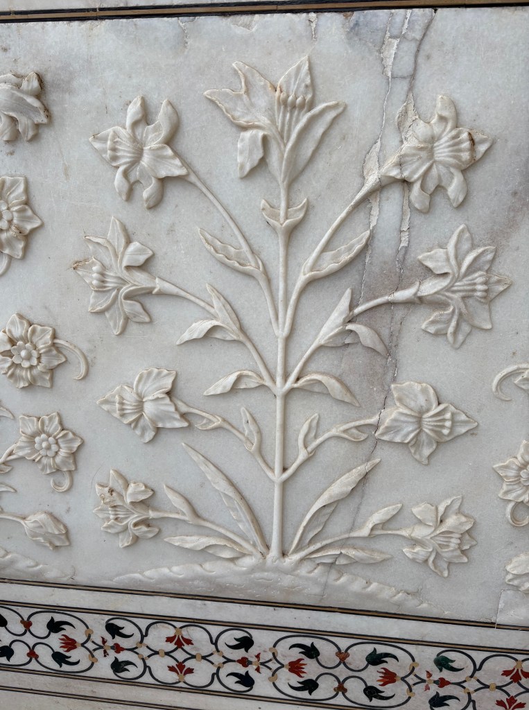 About 1,000 elephants were used to transport the heavy, pure white marble from its origin in Makrana, Rajasthan. The translucent marble changes color depending on the time of day, from bluish at dawn, to pinkish in the evening, to golden under moonlight. Immy pointed out the incredible craftsmanship utilized to create lettering, designs, ornamental effects and carvings. The famed towers of the Taj Mahal actually lean outward so that they appear perfectly straight from all angles.