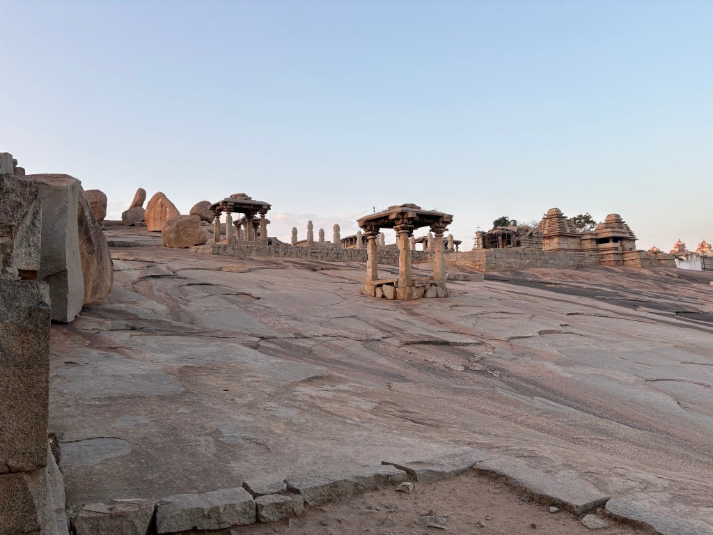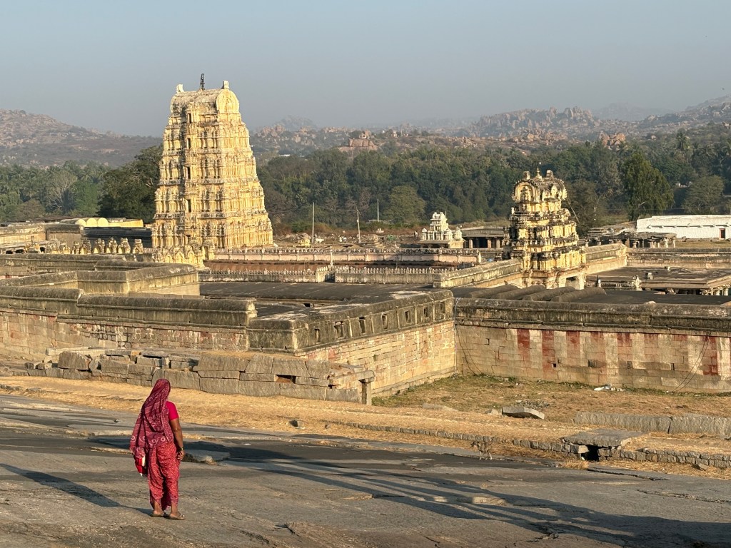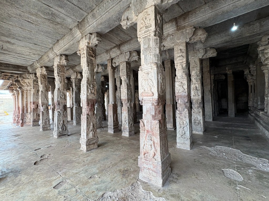 It’s impossible for me to describe everything that is here. The temple has been functioning uninterruptedly since it was built in the 7th Century. Pilgrims and worshipers come and go from 5 am till 9 at night. Many sleep outside under the ruins of the old bazaar that stretches nearly a mile east to many other temple grounds and magnificent sites. The spiritual vibrations never stop. During the Vijayanagara Expansion (14th-16th Century) the temple grew into the grand complex it is today under rulers like Deva Raya II (through chieftain Lakkana Dandesha) and Krishnadevaraya, who added ornate halls and gateways.