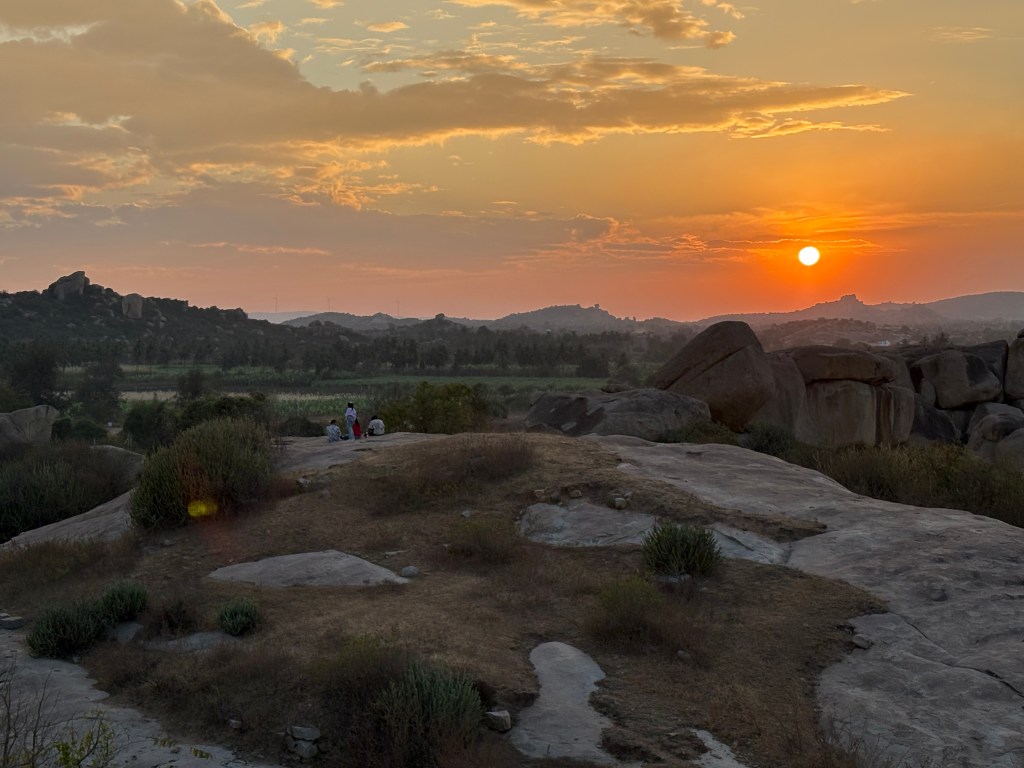 From the moment I arrived in Hampi, I knew that this would be a special experience unlike any before. My host led us into the small center of town over a bumpy road. We came around a stone wall and before us opened up a scene from 600 years ago: the Virupaksha Temple rose up in all its splendor, dominating the skyline and featuring a massive, nine-tiered eastern gopuram (tower) with intricate carvings. Dedicated to Lord Shiva, the original 7th Century complex now consists of a number of smaller towers, courtyards, pillared walkways and ruins that extend up the hill behind in numerous variations of worship to many Hindu gods and goddesses.