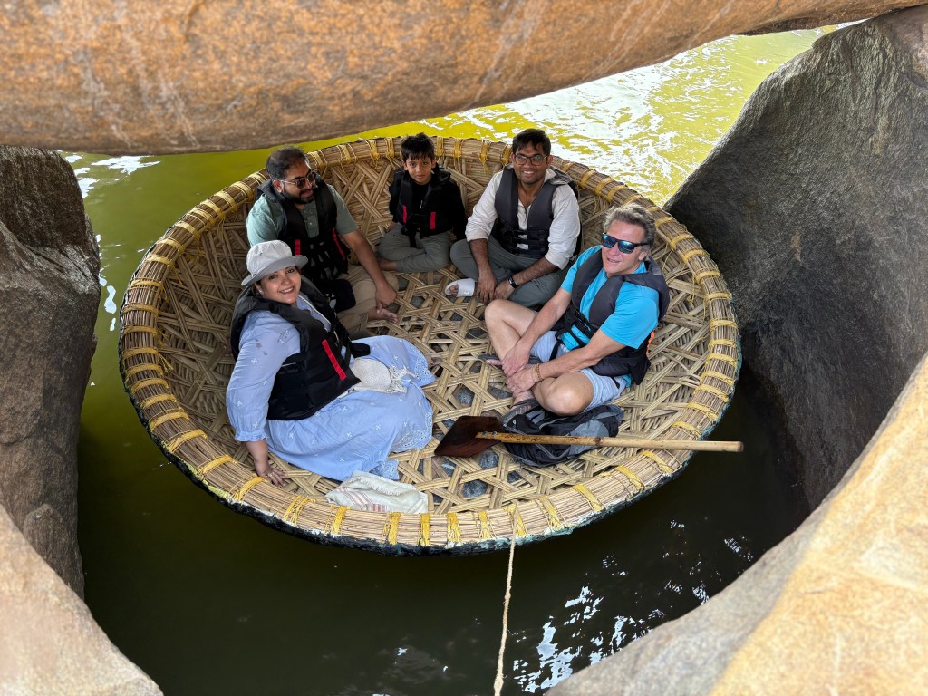 After following a walkway that ran between and under massive boulders, I came to a landing near the river where mobs of people gathered at the bank to board coracles. I just followed them all down to the water and stood there for a minute or so until a nearby group shouted in a friendly manner, “Hey! We’re waiting for you.” Oh, ok. I got in and away we went…