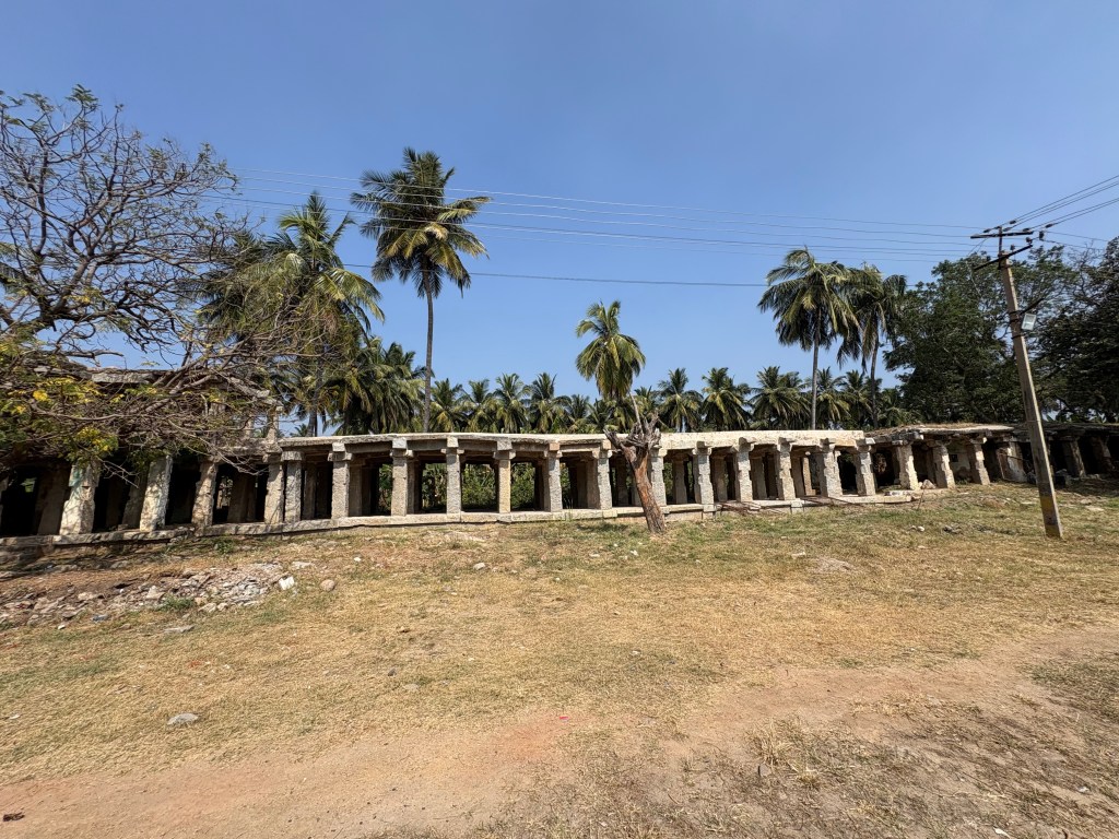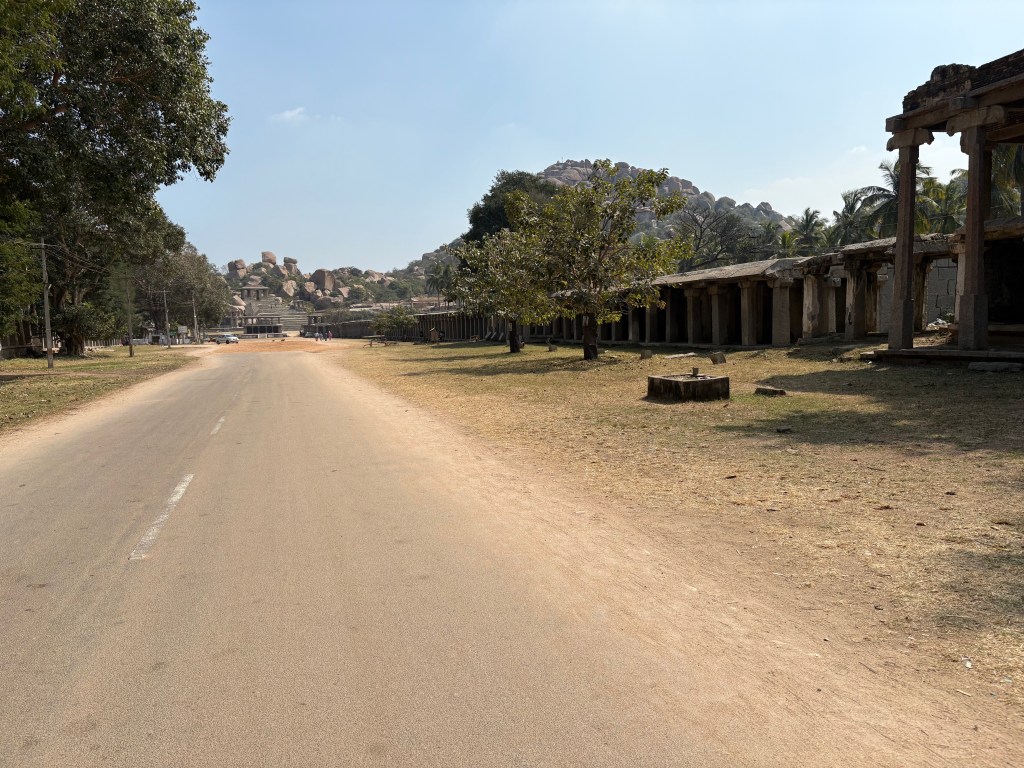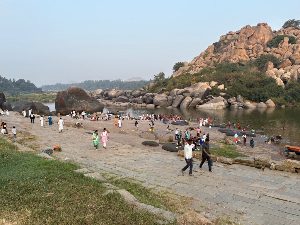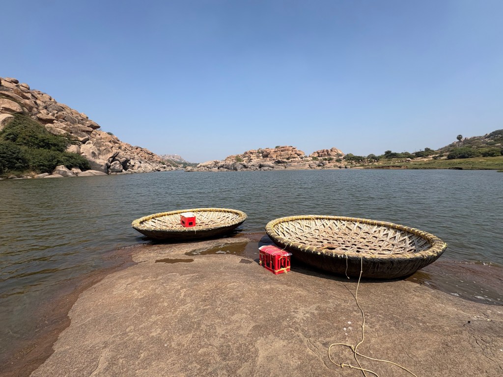 My mission for the day: Ride the river in one of those giant woven baskets I saw shipwrecked on shore yesterday. To get to the launching pad I wound through the very narrow paths of Hampi’s small center — there are few vehicles because entrance to the center is strictly enforced — and hit the road to Hampi’s grand bazaar, which stretches for kilometers down vast boulevards bordered by massive stone pavilions that served as shop fronts selling textiles, jewels, horses, spices, and exotic goods of the Vijayanagara Empire. Now visiting families sleep under these structures between raucous religious celebrations and set up shop on neighboring streets selling fruits, vegetables, assorted nuts and grains, fabrics, fruit drinks and jewelry.
