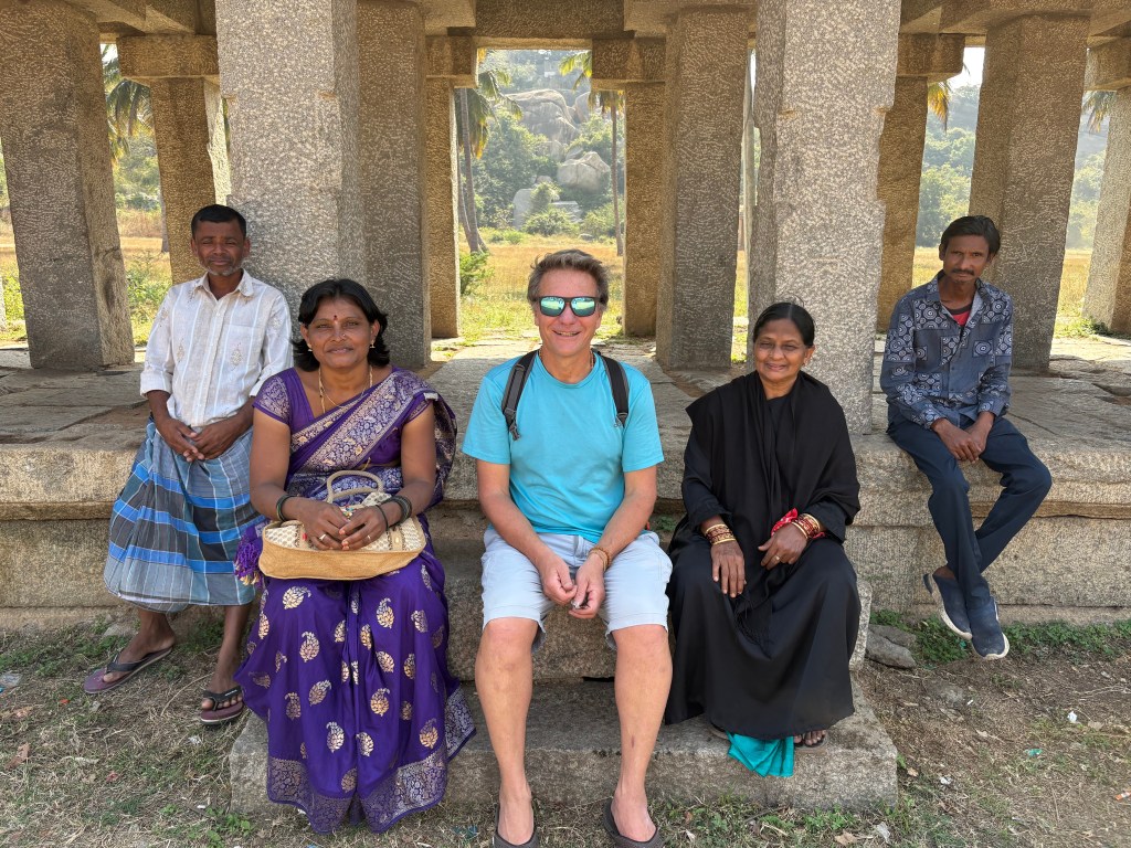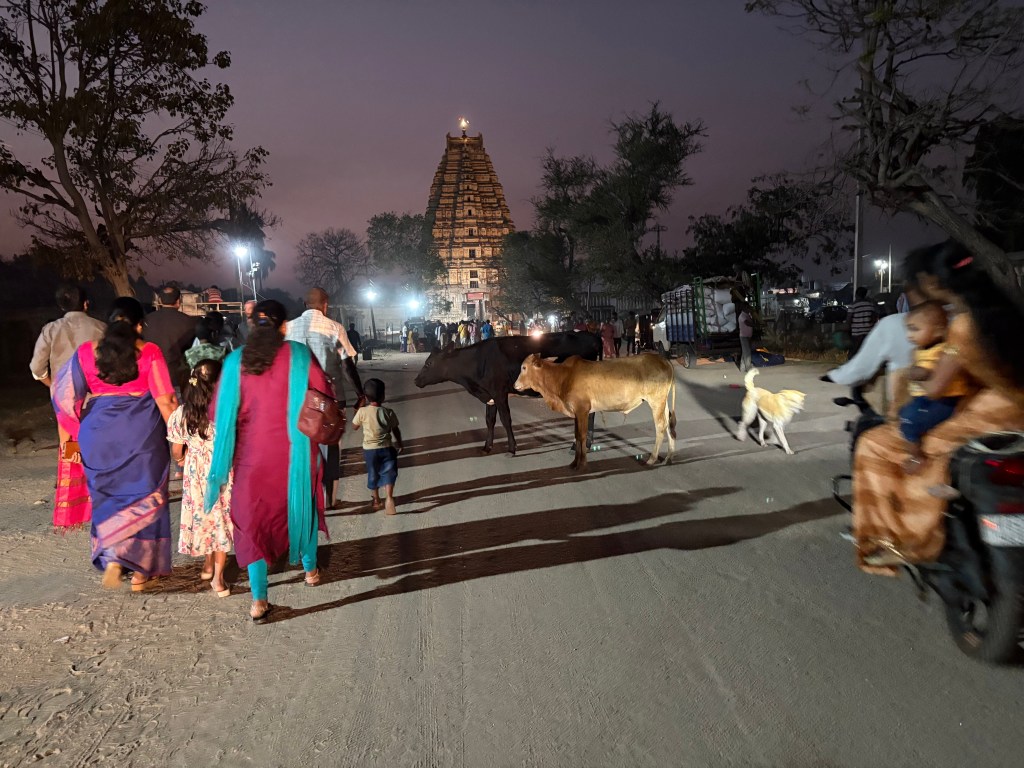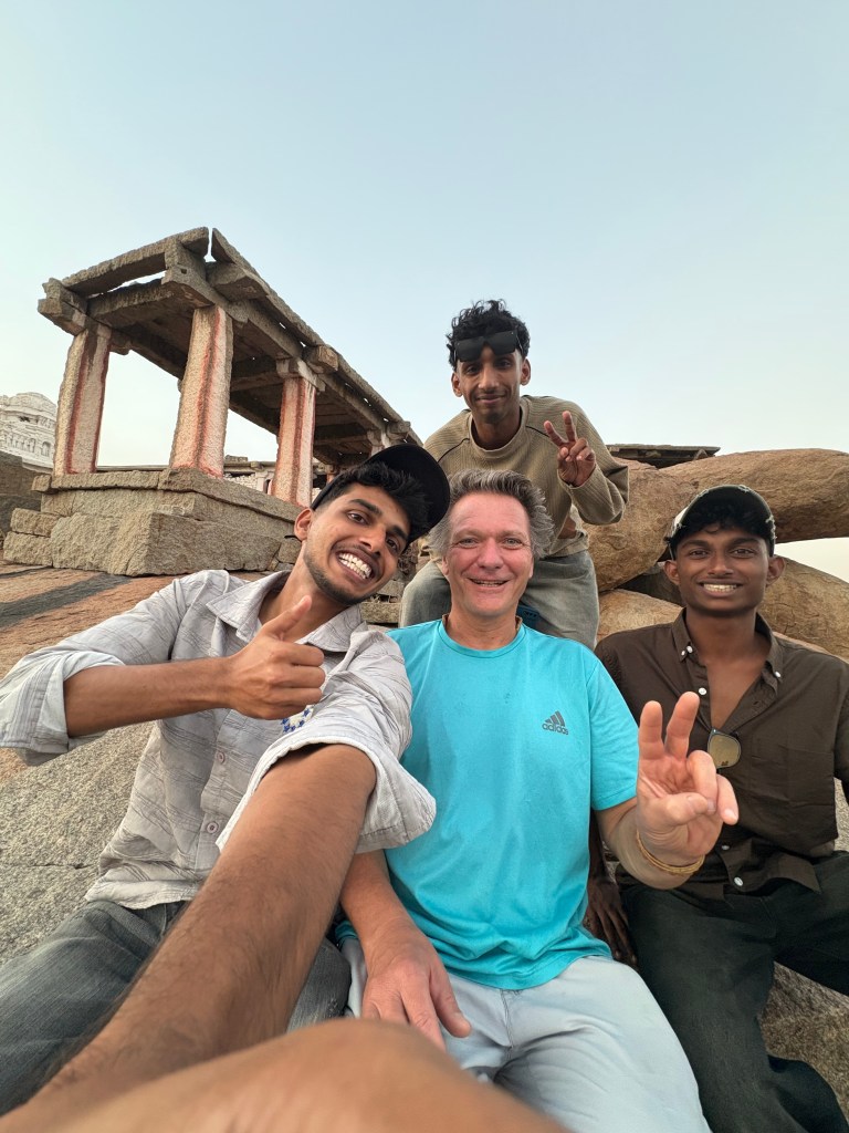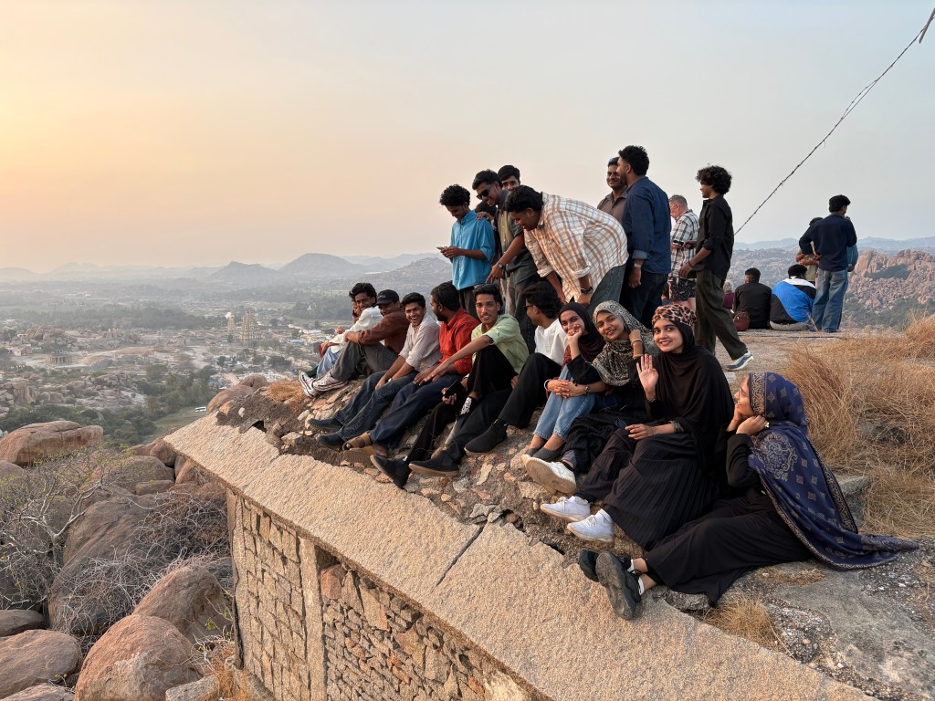 After that ride I worked my way back over volcanic rock and past more ruins of temples to Matanga Hill, where I caught the sunset with a large group of traveling students from the souther region of Kerala known as God’s country (really? Then what is this place called??). One of the students ran to catch up with me and made the difficult climb up ancient steps to the top with me, engaging me in a lively conversation. At the top we met his friends and many classmates gathered at a small shrine where Hanuman met Rama.