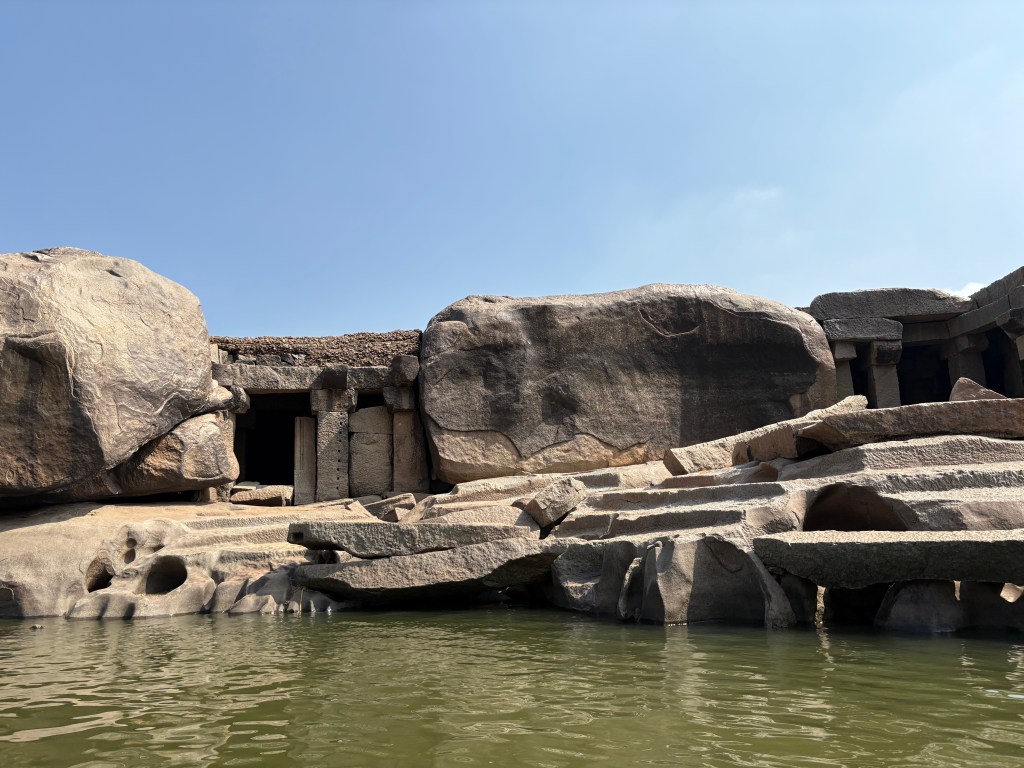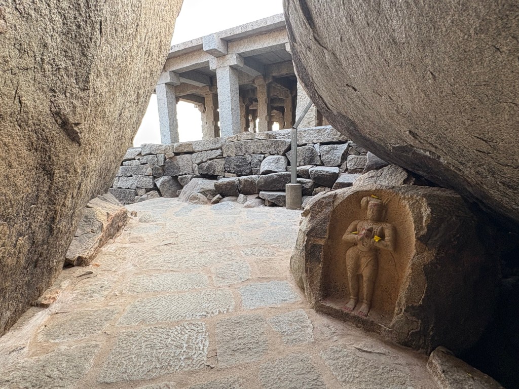 On either side of the riverbank we passed mini temples and stone meditation rooms. In Hampi you can’t throw a stone without hitting a temple. Or your head on a boulder. Our mischievous driver took us into an enclave of boulders and left us stranded there.