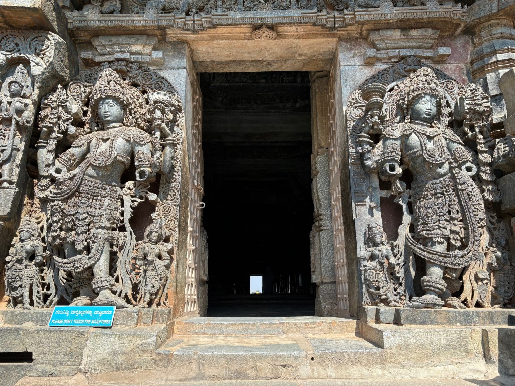 One of my traveling companions in Dwarahat, Nanjun, lives in Bengaluru and told us of fantastic temples in his home region of Karnataka, so from Hampi I took a car to Halebidu to begin my tour of these UNESCO World Heritage Sites. It was a beautiful drive through vast fields bordered by mountains and covered with green palms and verdant vegetation. The only problem: my driver texted the entire way. After nearly ramming into a stalled truck on the road that suddenly appeared after another truck veered out of the way, I asked him to please stop texting. He stopped…for about two minutes. I asked again. Same thing. Turned out he was texting on two phones and completely addicted while we maneuvered through the insane Indian traffic.