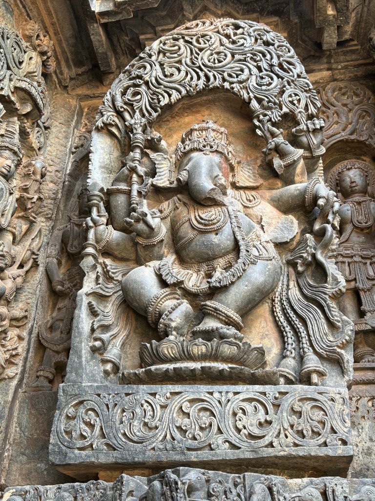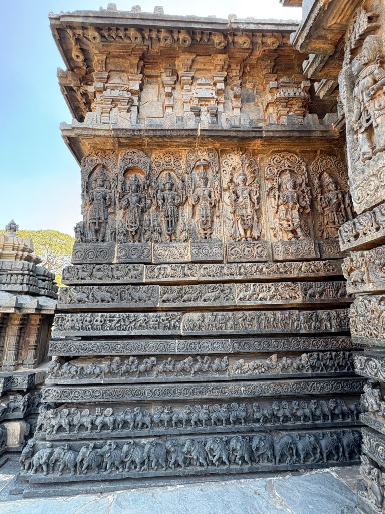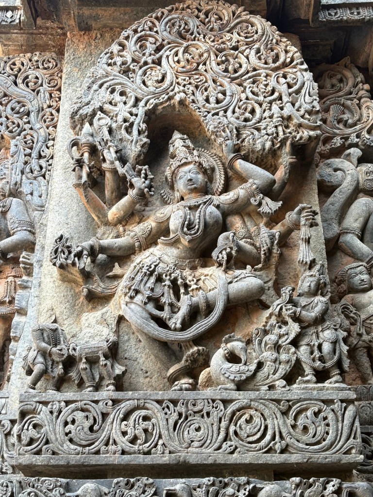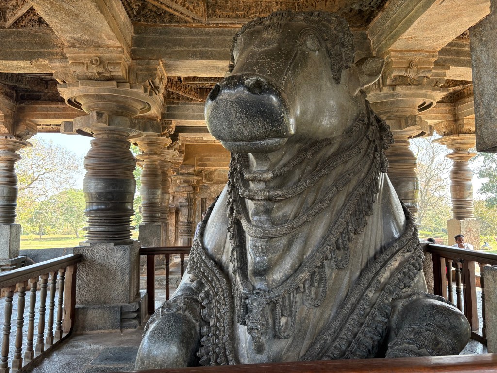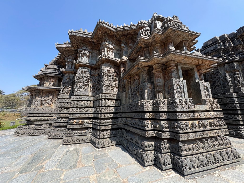 I then crossed the street and entered the Hoysaleshwara Temple grounds. Canvas-like layers of intricate carvings in the temple walls told tales from the Shiva Purana, Bhagavatha Purana, and Ramayana epics. The extent of this detailed work boggled my mind. Everywhere I looked fantastic images and statues told of a golden era of craftsmanship and empire. This temple is nearly 1,000 years old and took 117 years to complete (1117 to 1235 CE).