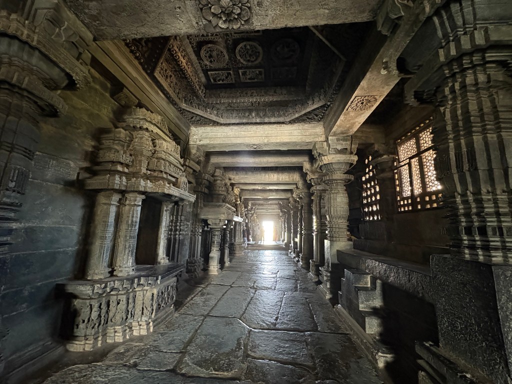 The interior of the temple provided a cool contrast to the blazing sun outside. The intimate design and vibration of silent devotion contrasted with the complex designs of the outer walls and featured polished soapstone, intricately carved pillars, and two main sanctums (𝑔𝑎𝑟𝑏ℎ𝑎−𝑔𝑟𝑖ℎ𝑎) housing large Lingams. A sense of worship permeated the overall atmosphere.