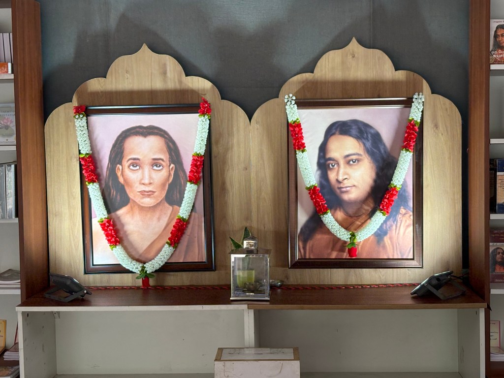 I must admit that I replaced worshipful pauses at the holy shrines with pitstops at the many tea stands that lined the way. At the halfway point I was delighted to see a Yogoda Satsanga Society tent with large, framed pictures of Mahavatar Babaji and Paramahansa Yogananda. I went in and spoke for some time with the young man managing sales of books and assorted goods. I bought a small booklet and an attractive string of mala beads for counting my Kriyas.