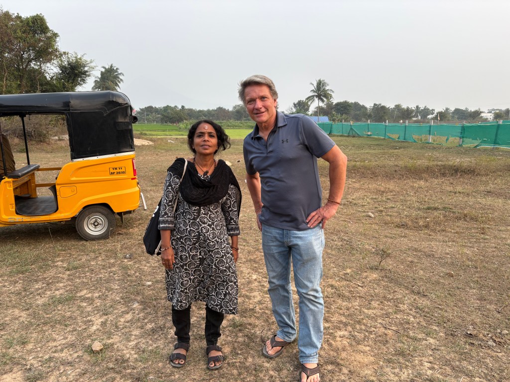 “I’ll take you,” she said. What kindness! We met at the entrance to Ramana Ashram and took a rickshaw on a 30-minute ride into deep country. Farmers walked along the dirt roads with livestock or drove farm machinery. A majestic mountain stood in the distance, beyond palm and mango trees as the sun set in the azure sky. We finally stopped at a house where Soly’s friend greeted us. Turns out he was a devotee of Aum Amma and took great care of her.