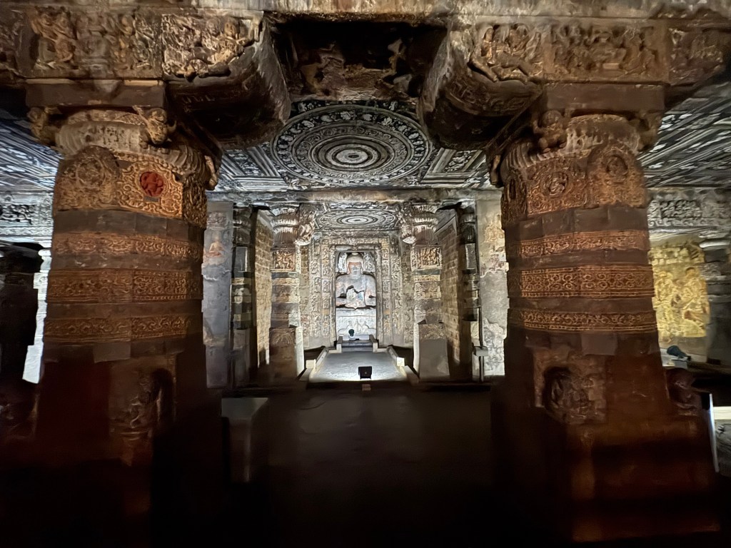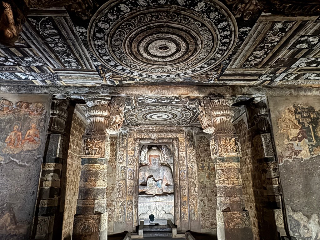Cave 2 features a lovely painted ceiling and intricately decorated pillars and walls. Just stepping into these caves carries your consciousness to a different level, and your body to a cooler temperature. So soothing, relaxing, and vibrant with artistry and devotion.
